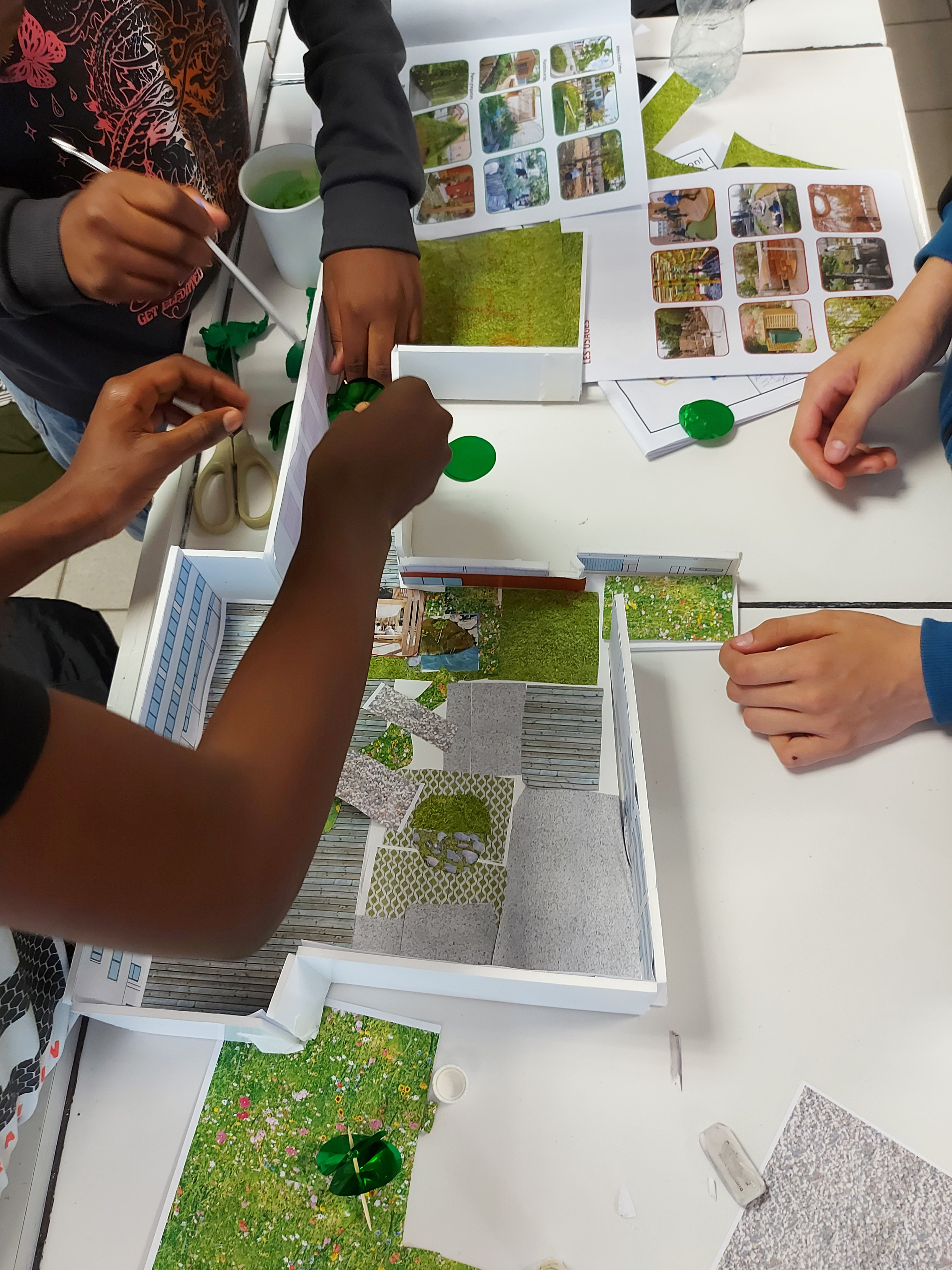 D’octobre à novembre 2022, le CAUE 93 mènera un dispositif de concertation auprès des différents publics fréquentant l’établissement. Tout d’abord, les élèves, premier.e.s usager.e.s de la cour de récréation. Six ateliers de sensibilisation puis de conception sont conduits avec la classe ambassadrice de 5e6 de 24 élèves. Les enfants, en petits groupes, travailleront en maquette pour proposer leurs idées de transformation de la cour. Ces travaux seront ensuite montrés à l’ensemble de l’établissement au travers d’une exposition présentant la démarche, et les autres élèves ainsi que les adultes pourront soutenir leurs idées préférées à travers un vote. Cette étape permet de faire émerger les éléments (types de sol, de végétation…) et les équipements suscitant le plus d’enthousiasme afin de les intégrer au projet final.