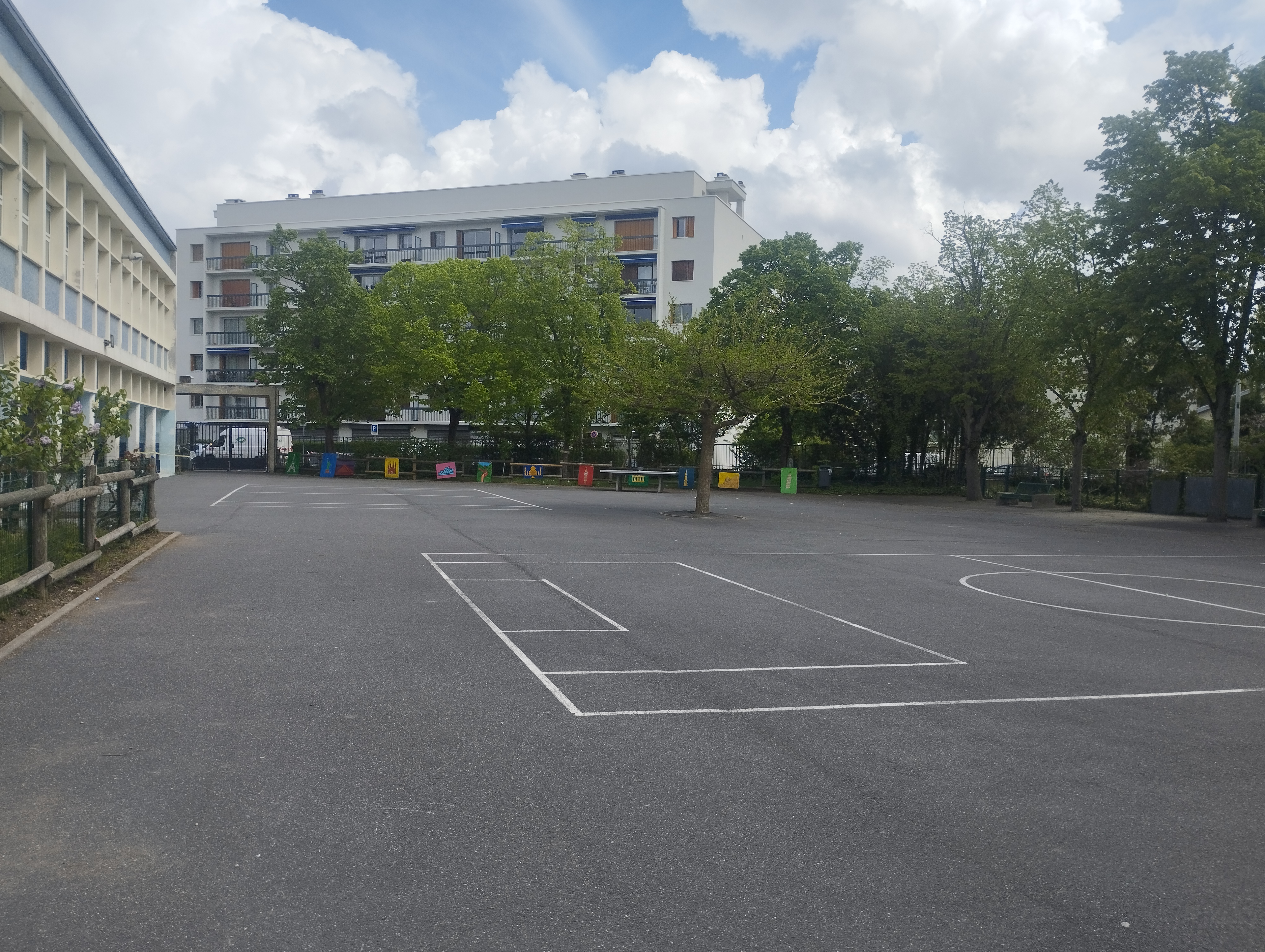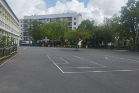 L’école dispose de deux cours de récréation exposées au sud-est, d’une superficie totale de 2600 m² : une cour pour les petits d’environ 1400 m² et une cour pour les grands d’environ 1200 m². Ces deux espaces présentent une configuration similaire et se caractérisent par un manque de végétation et d’équipements. Une lisière végétalisée en bordure vient marquer la séparation avec la rue. Hormis ces plantations périphériques, les cours sont entièrement asphaltées, agrémentées de quelques bancs, de tables de ping-pong et de marquages au sol. À l’échelle du quartier, ces surfaces minérales participent à l’effet d’îlot de chaleur et ne constituent pas un environnement favorable au bon développement et à l’épanouissement des enfants.