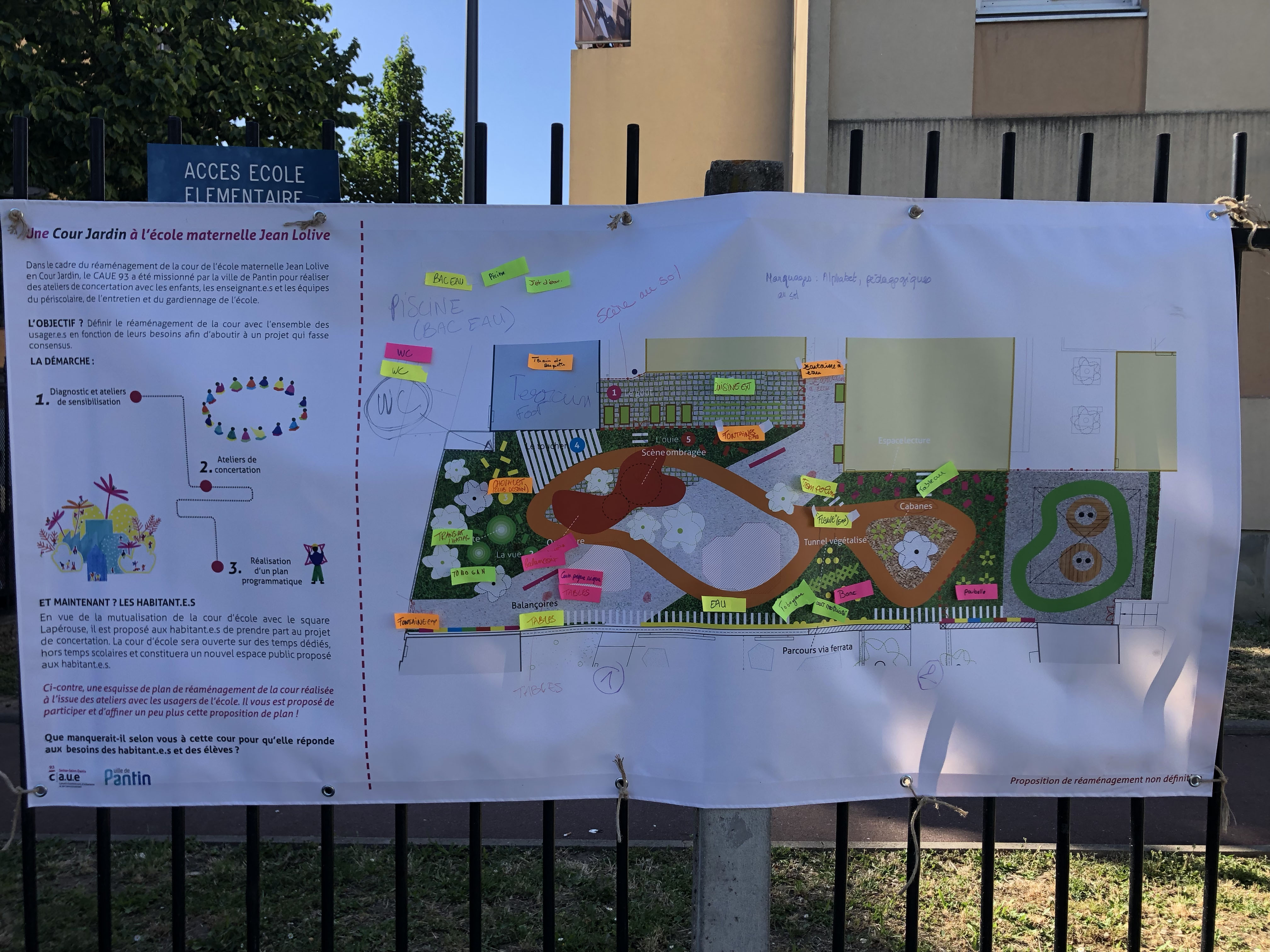 La ville de Pantin a fait appel au CAUE afin de mettre en place un dispositif de concertation pour co-construire le projet de réaménagement de la cour de récréation maternelle du groupe scolaire Vaillant-Lolive selon les principes de cours oasis. En plus des enjeux de renaturation et de diversification des usages, l’un des objectifs du projet est de mutualiser la cour maternelle Lolive, en l’ouvrant dans le prolongement du Square Lapérouse, sur d’autres temps et à d’autres publics que ceux scolaires.
