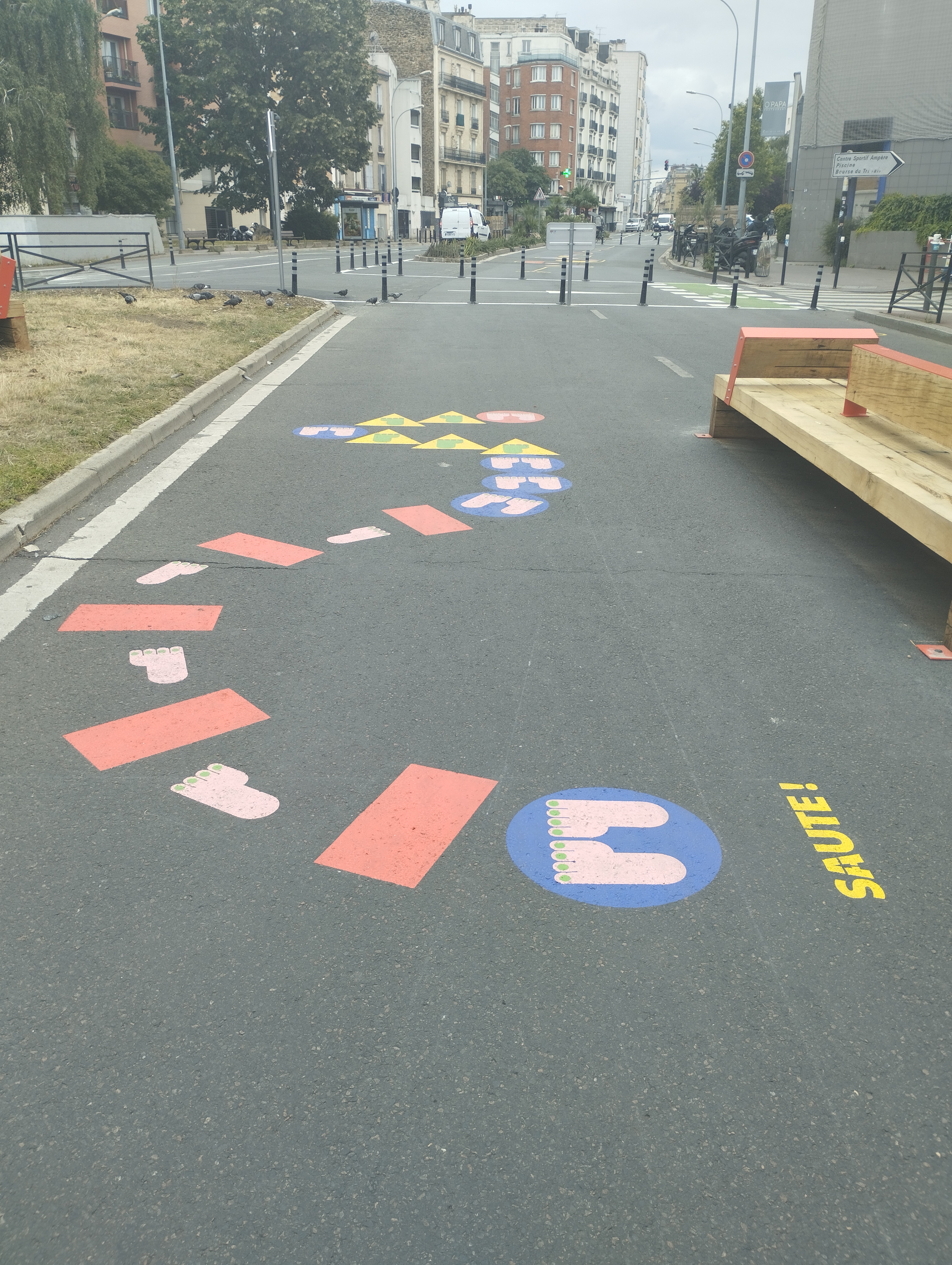 Suite à une phase de diagnostic et de programmation réalisée de février à mars 2023, le groupement a conçu puis installé les aménagements en juillet 2023. Le projet suit une identité graphique qui reprend les couleurs du drapeau paix. Sous la casquette, le long de la zone de rencontre, une fresque colorée et des supports contributifs sont installés sur le mur. À l’arrière de la patinoire, du mobilier vient activer l’espace enherbé et se prolonge sur l’ancienne voie routière. Un parcours sportif et ludique est suggéré par des marquages au sol. Afin d’animer l’espace pendant l’occupation temporaire et tester des pratiques, des temps forts d’activation d’une demi-journée sont animées par le groupement (atelier photo, animations sportives…).
