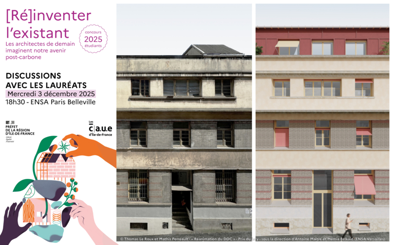 Suite à la proclamation des résultats de la troisième édition du concours étudiant [Ré]inventer l'Existant 2024-2025, initié par la DRAC et DRIEAT ÎIe-de-France, les CAUE franciliens vous invitent à participer à une rencontre avec les étudiants et enseignants des projets lauréats. Cette soirée que nous espérons riche en échanges se prolongera par un pot convivial.