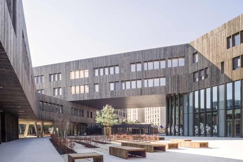 Le lycée, l’internat et les logements de fonction sont posés au-dessus de la restauration, ce service mutualise et rassemble l’ensemble des programmes.
