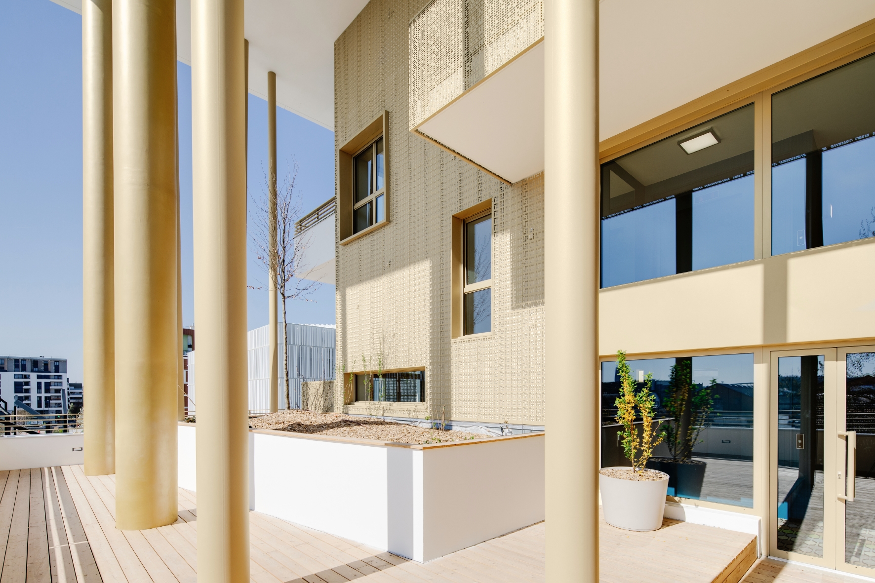 Ces jardins fabriquent des séquences et des proportions qui troublent la lecture du nombre de niveau en apaisant la perception de la grande échelle. Les jardins superposés représentent l’occasion de concevoir des lieux uniques et poétiques. L’habitant peut identifier son logement depuis l’extérieur grâce au jeu des loggias, mais aussi à travers l’identité de sa cour-jardin, qui devient comme une adresse en plus au sein de son immeuble.