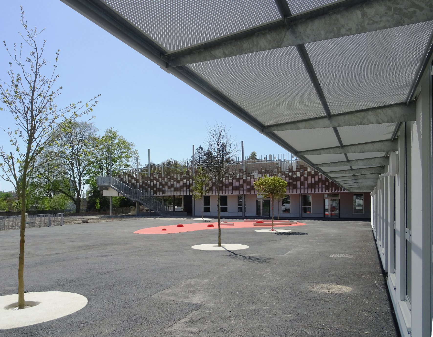 Côté cour l’école s’ouvre sur les espaces récréatifs arborés. Elle s’étage en plateaux/terrasses. Chaque niveau accueille un programme et une ambiance spécifique. Au RDC l’école maternelle adopte des formes courbes et douces. Avec les espaces de restauration elle s’ouvre sur un patio et la cour arborée que prolonge un site naturel. Ici se trouve réunis les jardins pédagogiques, des arbres remarquables, les bassins d’infiltration des eaux de pluie et autres lieux d’observation de faunes et flores. A l’étage, l’école élémentaire se prolonge d’une cours en balcon qui s’étend à la toiture jardin pédagogique accessible aux enfants du primaire. Le tout crée un paysage, un tableau végétal pour les riverains.