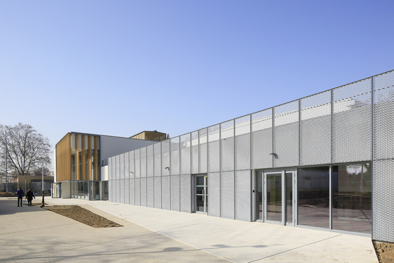 Quand au nouveau gymnase c’est un bâtiment qui montre ainsi une identité renouvelée et contemporaine. Les locaux partagés ont été associés au gymnase existant pour former son nouveau volume. Une expression volontairement retenue pour garder malgré tout une différenciation avec la MPT.