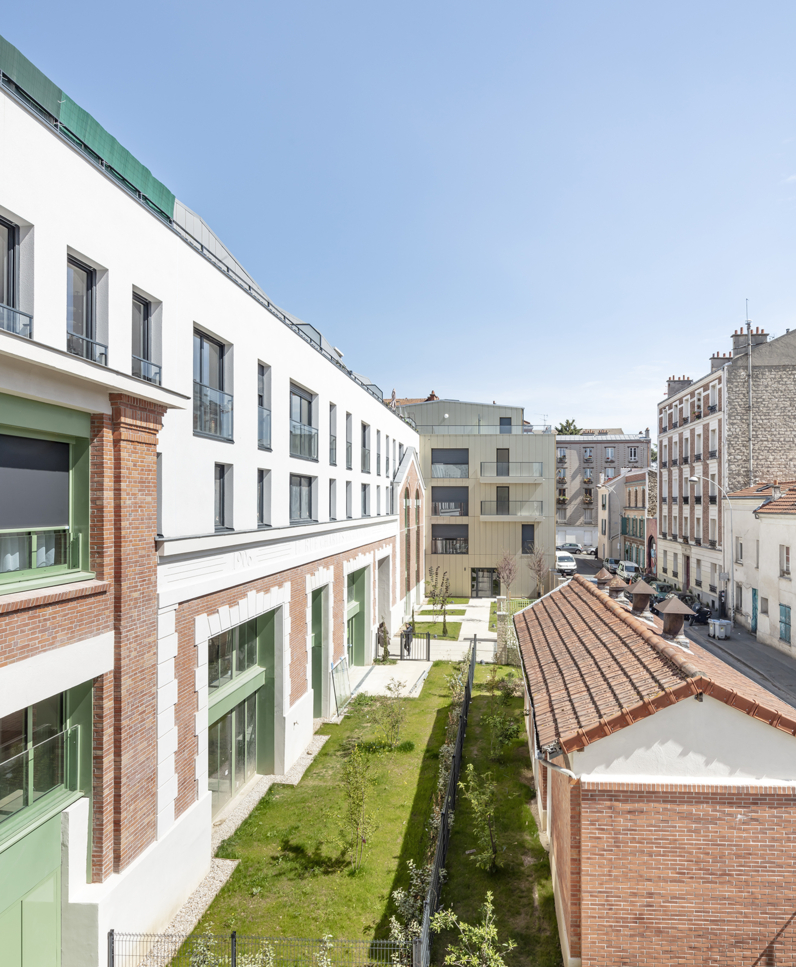 D’autre part, celle du bâtiment, en tirant parti de la réhabilitation des anciennes usines Belin, inscrites au patrimoine industriel remarquable de la ville de Bagnolet. Le projet s’inspire de l’existant pour proposer une diversité de volumes, teintes et matières. Une cour d’honneur est recréée avec une nouvelle aile, révélant un pendant contemporain de celle conservée.
