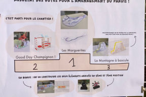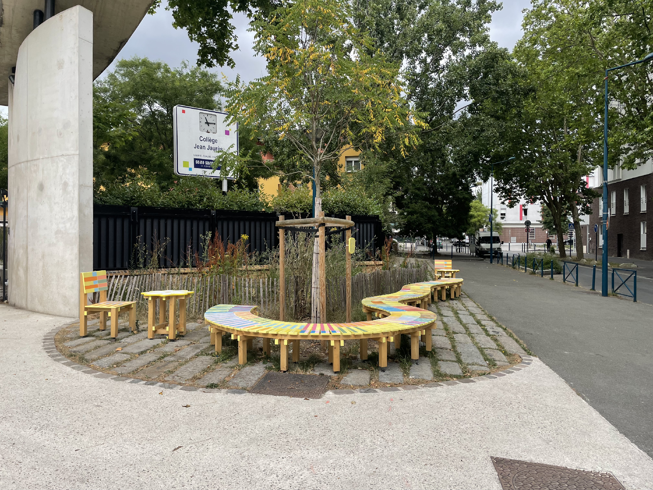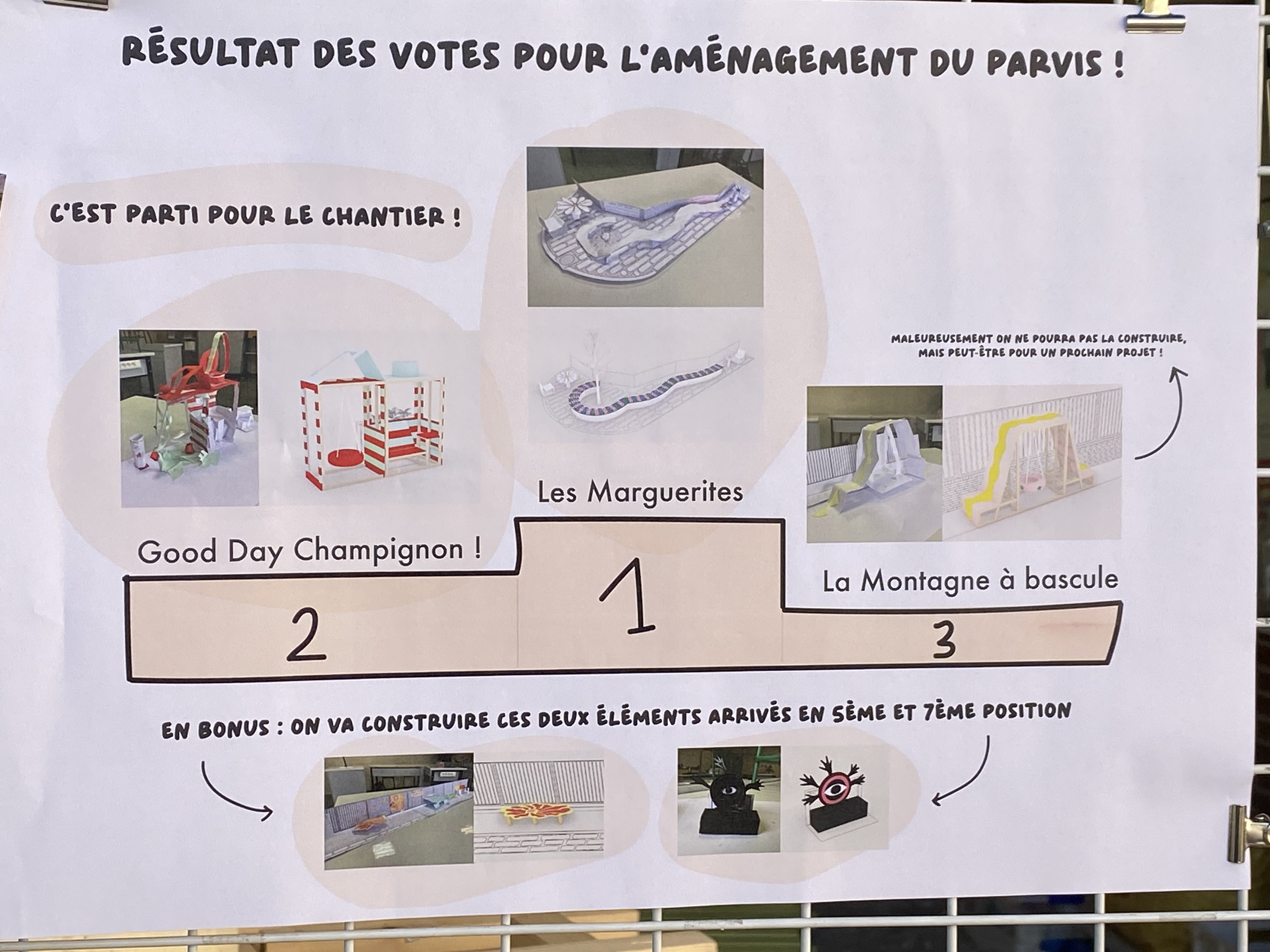 Cette intervention du caue est venue étayer le projet la voix des enfants mis en œuvre par le collectif en résidence IN SITU dont l’objectif est « l’exploration artistique et politique de nos lieux de vie et relations ». Cette approche sensorielle et spatiale a abouti à la modélisation d’installations de mobiliers et au vote collectif de l’ensemble des classes pour la coréalisation de 3 mobiliers : une table, une chaise et un banc aux formes sinueuses en écho à l’immeuble Serpentin de l’architecte Emille Aillaud. Plusieurs ateliers ont permis d’initier à la conception de maquettes et à la co-fabrication d’un nouveau mobilier, en partenariat avec Jonathan Roditi, designer. Ces mobiliers implantés sur le parvis ont été inaugurés le 16 juin 2025.