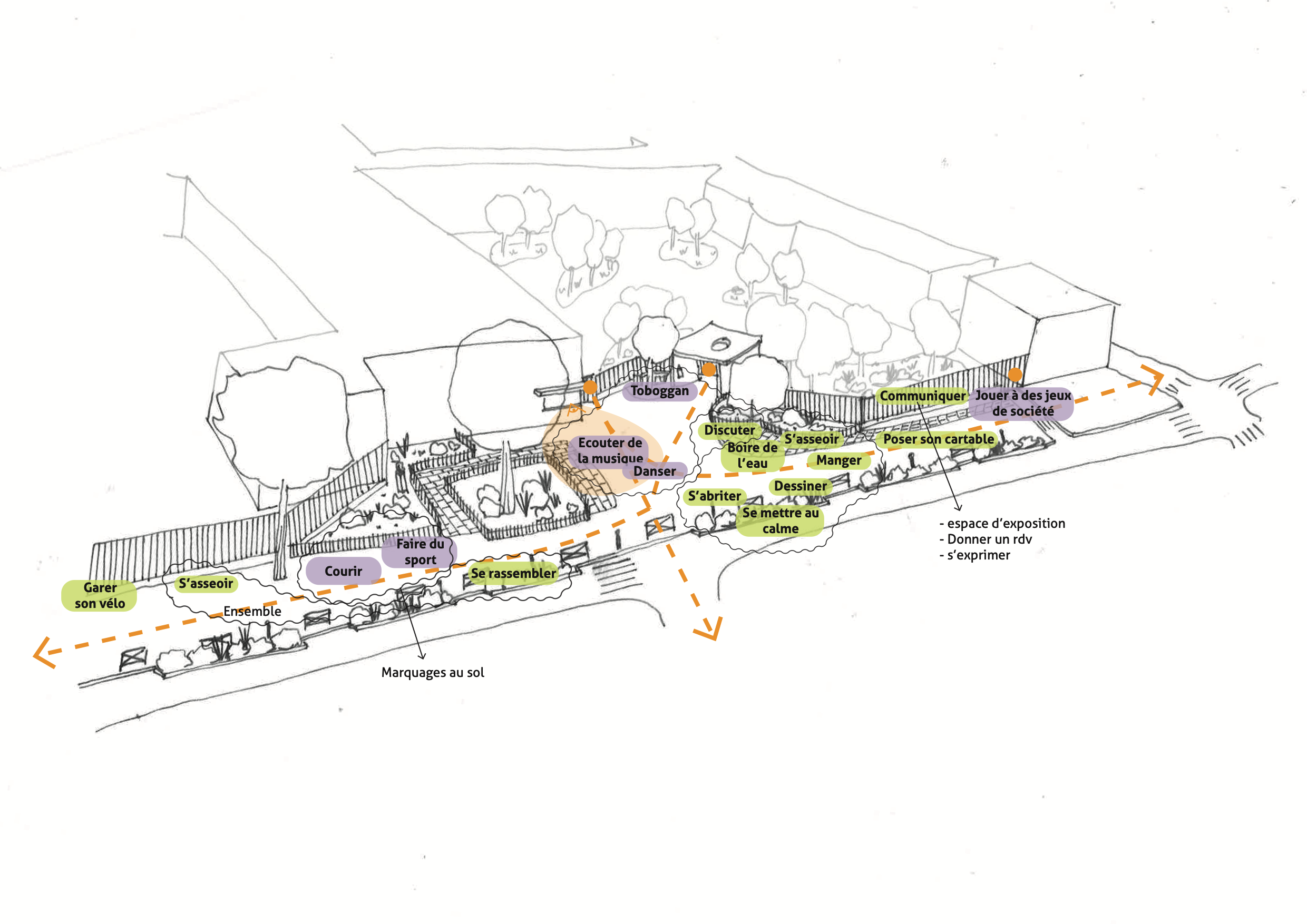 Au cours de l’atelier, les élèves ont exprimé plusieurs idées sur la base d’une liste d’actions (actions calmes/ actions dynamiques), en mots et en images, en premier, en explicitant leurs sensations et ressentis et en deuxième, en dessinant des propositions d’aménagement pour la zone publique du parvis préalablement repérée.
